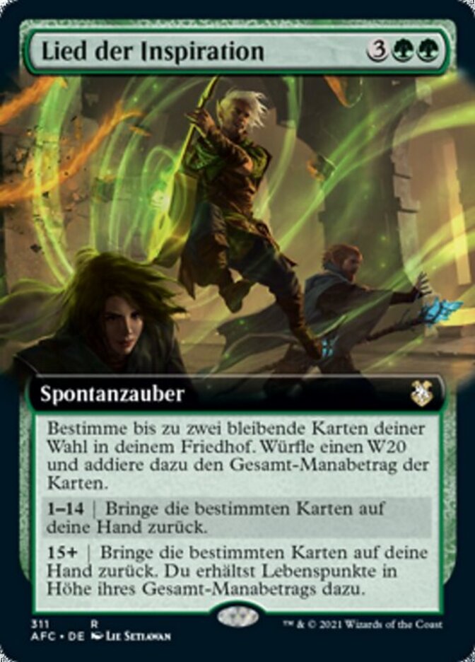 | Rules | Choose up to two target permanent cards in your graveyard. Roll a d20 and add the total mana value of those cards. 1—14 | Return those cards to your hand. 15+ | Return those cards to your hand. You gain life equal to their total mana value. |