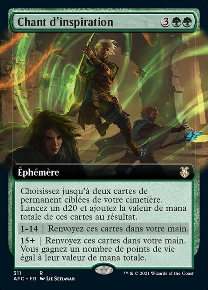 | Rules | Choose up to two target permanent cards in your graveyard. Roll a d20 and add the total mana value of those cards. 1—14 | Return those cards to your hand. 15+ | Return those cards to your hand. You gain life equal to their total mana value. |