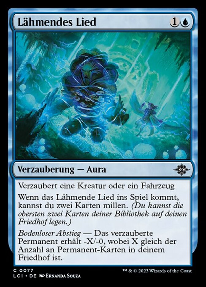 | Rules | Enchant creature or Vehicle When Song of Stupefaction enters the battlefield, you may mill two cards. (You may put the top two cards of your library into your graveyard.) Fathomless descent — Enchanted permanent gets -X/-0, where X is the number of permanent cards in your graveyard. |