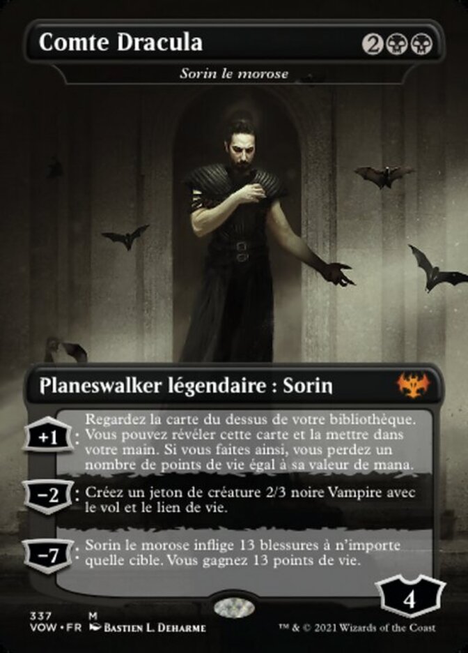 | Rules | +1: Look at the top card of your library. You may reveal that card and put it into your hand. If you do, you lose life equal to its mana value. −2: Create a 2/3 black Vampire creature token with flying and lifelink. −7: Sorin the Mirthless deals 13 damage to any target. You gain 13 life. |