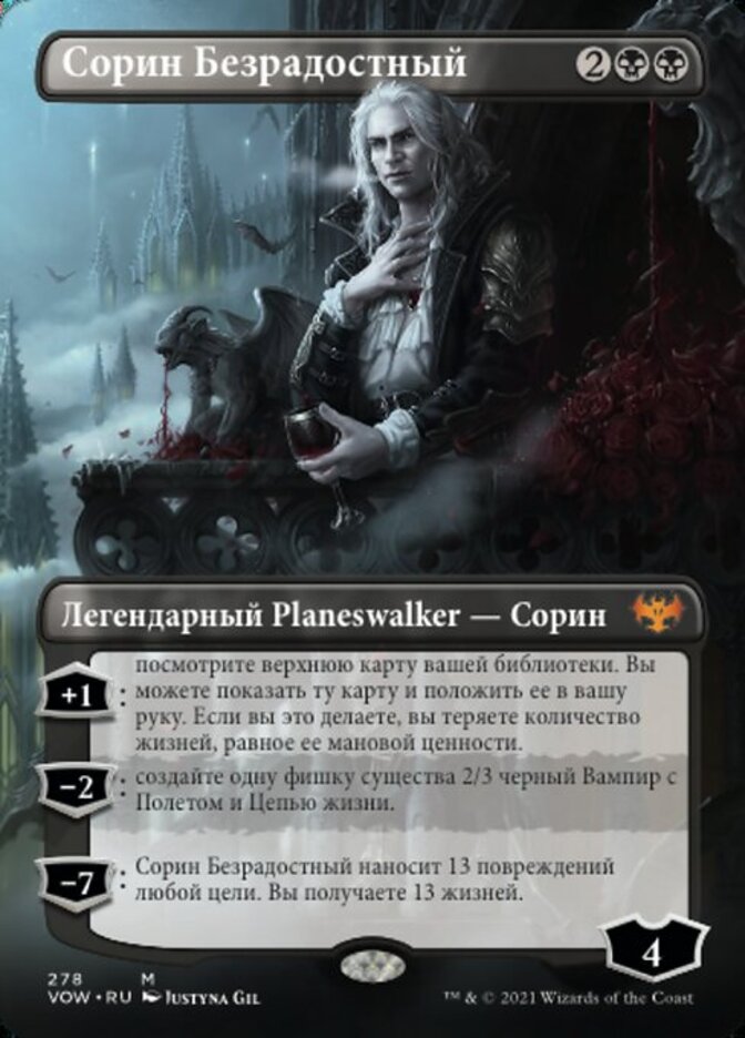 | Rules | +1: Look at the top card of your library. You may reveal that card and put it into your hand. If you do, you lose life equal to its mana value. −2: Create a 2/3 black Vampire creature token with flying and lifelink. −7: Sorin the Mirthless deals 13 damage to any target. You gain 13 life. |