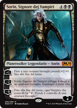 | Rules | +1: Up to one target creature gets +2/+0 until end of turn. −2: Sorin, Vampire Lord deals 4 damage to any target. You gain 4 life. −8: Until end of turn, each Vampire you control gains ": Gain control of target creature." |