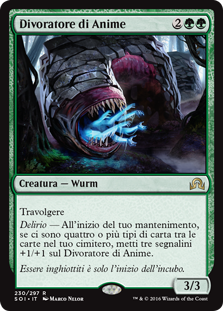 | Rules | Trample Delirium — At the beginning of your upkeep, if there are four or more card types among cards in your graveyard, put three +1/+1 counters on Soul Swallower. |