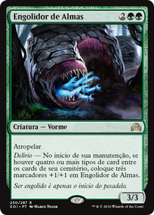 | Rules | Trample Delirium — At the beginning of your upkeep, if there are four or more card types among cards in your graveyard, put three +1/+1 counters on Soul Swallower. |