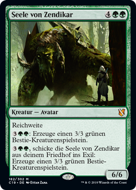 | Rules | Reach : Create a 3/3 green Beast creature token. , Exile Soul of Zendikar from your graveyard: Create a 3/3 green Beast creature token. |