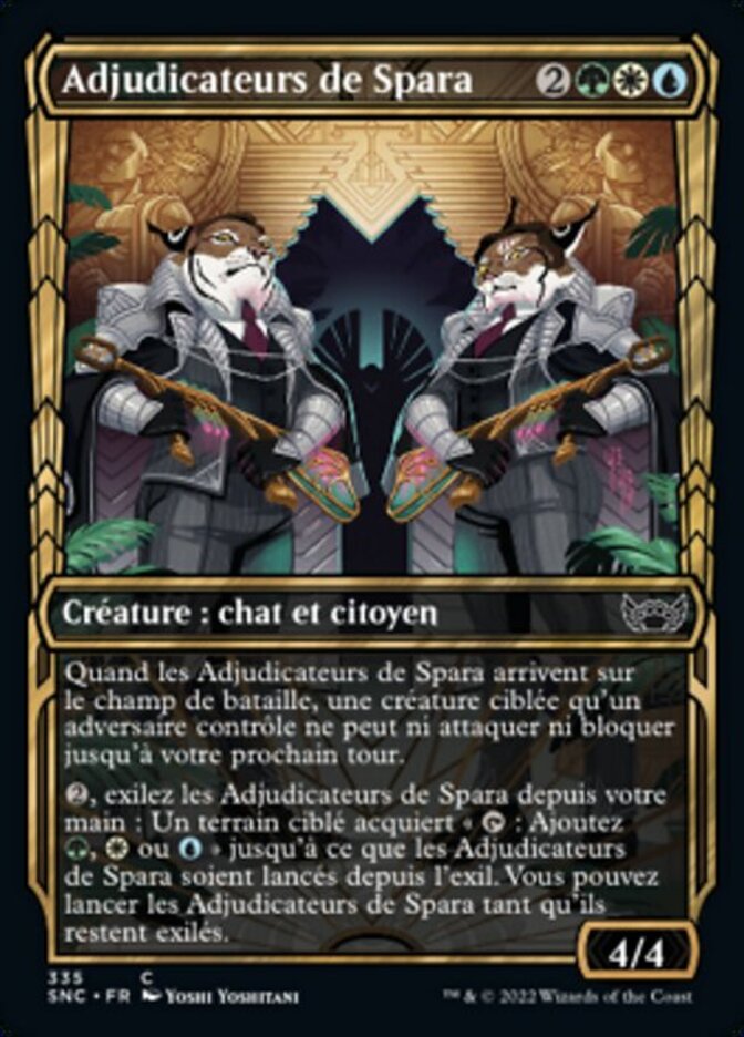 | Rules | When Spara's Adjudicators enters the battlefield, target creature an opponent controls can't attack or block until your next turn. , Exile Spara's Adjudicators from your hand: Target land gains ": Add , , or " until Spara's Adjudicators is cast from exile. You may cast Spara's Adjudicators for as long as it remains exiled. |