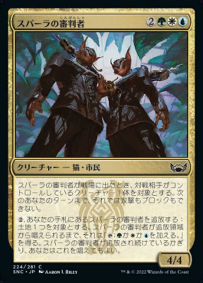 | Rules | When Spara's Adjudicators enters the battlefield, target creature an opponent controls can't attack or block until your next turn. , Exile Spara's Adjudicators from your hand: Target land gains ": Add , , or " until Spara's Adjudicators is cast from exile. You may cast Spara's Adjudicators for as long as it remains exiled. |