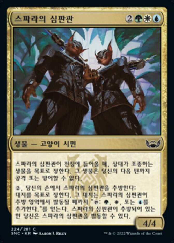 | Rules | When Spara's Adjudicators enters the battlefield, target creature an opponent controls can't attack or block until your next turn. , Exile Spara's Adjudicators from your hand: Target land gains ": Add , , or " until Spara's Adjudicators is cast from exile. You may cast Spara's Adjudicators for as long as it remains exiled. |