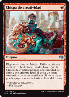 | Rules | Choose target creature. Exile the top card of your library. You may have Spark of Creativity deal damage to that creature equal to the exiled card's mana value. If you don't, you may play that card until end of turn. |