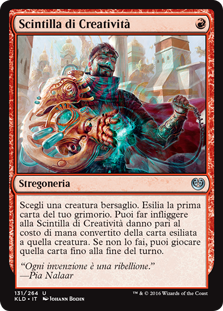 | Rules | Choose target creature. Exile the top card of your library. You may have Spark of Creativity deal damage to that creature equal to the exiled card's mana value. If you don't, you may play that card until end of turn. |
