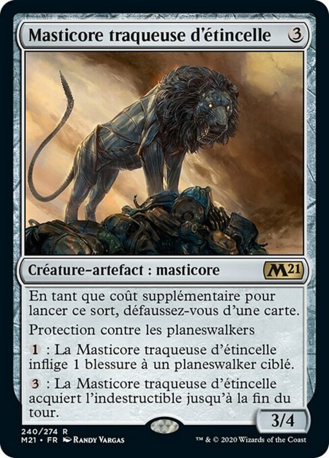 | Rules | As an additional cost to cast this spell, discard a card. Protection from planeswalkers : Sparkhunter Masticore deals 1 damage to target planeswalker. : Sparkhunter Masticore gains indestructible until end of turn. |