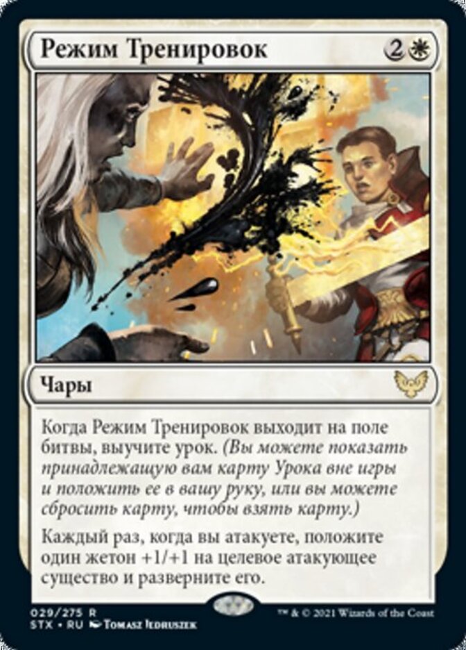 | Rules | When Sparring Regimen enters the battlefield, learn. (You may reveal a Lesson card you own from outside the game and put it into your hand, or discard a card to draw a card.) Whenever you attack, put a +1/+1 counter on target attacking creature and untap it. |