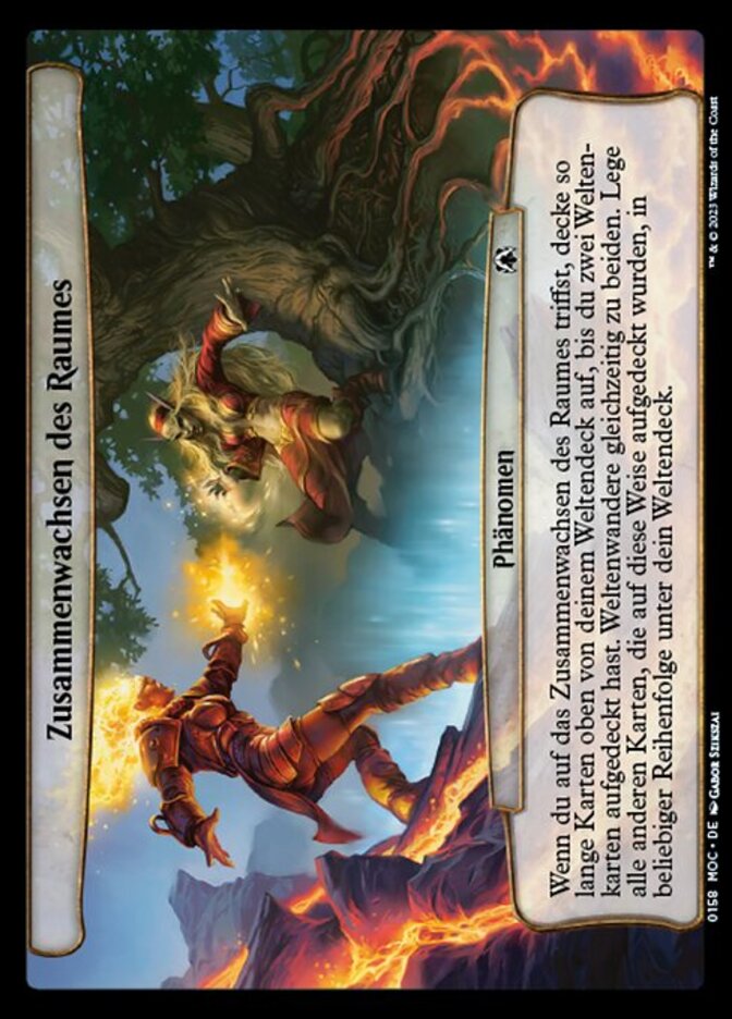 | Rules | When you encounter Spatial Merging, reveal cards from the top of your planar deck until you reveal two plane cards. Simultaneously planeswalk to both of them. Put all other cards revealed this way on the bottom of your planar deck in any order. |