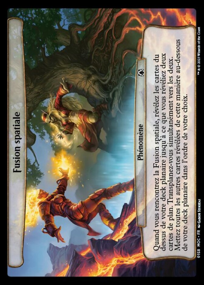 | Rules | When you encounter Spatial Merging, reveal cards from the top of your planar deck until you reveal two plane cards. Simultaneously planeswalk to both of them. Put all other cards revealed this way on the bottom of your planar deck in any order. |