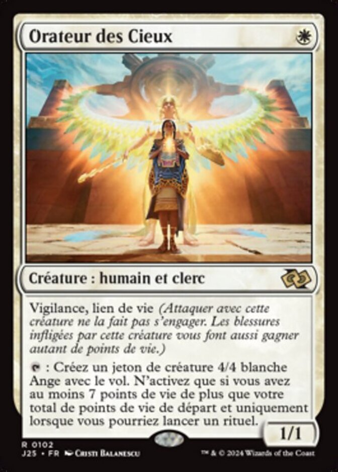 | Rules | Vigilance, lifelink : Create a 4/4 white Angel creature token with flying. Activate only if you have at least 7 life more than your starting life total and only as a sorcery. |