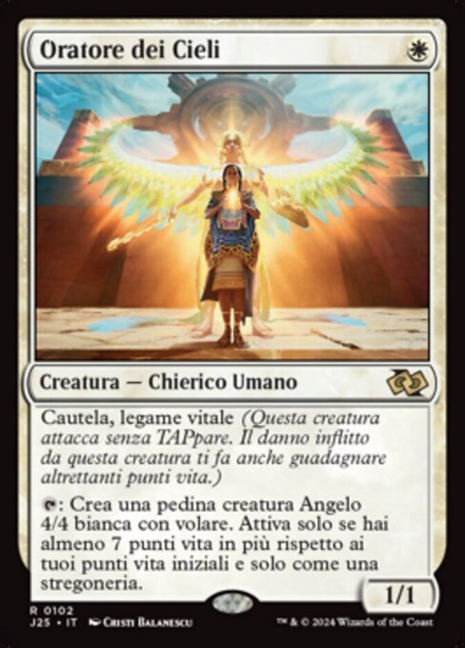 | Rules | Vigilance, lifelink : Create a 4/4 white Angel creature token with flying. Activate only if you have at least 7 life more than your starting life total and only as a sorcery. |