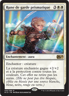 | Rules | Enchant creature Enchanted creature gets +2/+2 and has protection from all colors. This effect doesn't remove Auras. (It can't be blocked, targeted, or dealt damage by anything that's white, blue, black, red, or green.) |