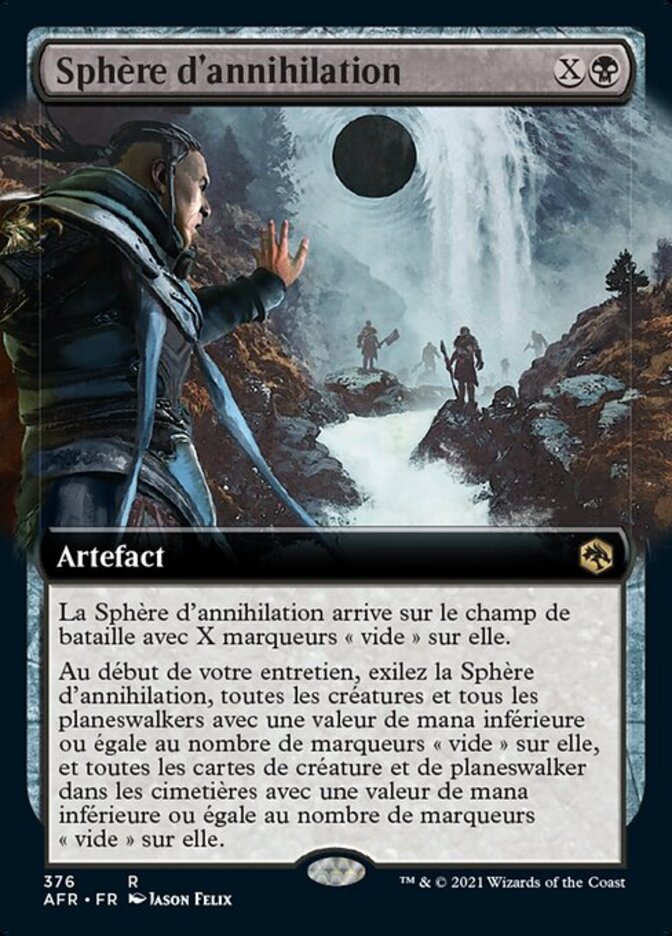 | Rules | Sphere of Annihilation enters the battlefield with X void counters on it. At the beginning of your upkeep, exile Sphere of Annihilation, all creatures and planeswalkers with mana value less than or equal to the number of void counters on it, and all creature and planeswalker cards in graveyards with mana value less than or equal to the number of void counters on it. |