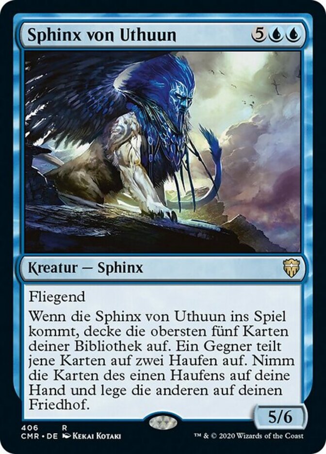 | Rules | Flying When Sphinx of Uthuun enters the battlefield, reveal the top five cards of your library. An opponent separates those cards into two piles. Put one pile into your hand and the other into your graveyard. |