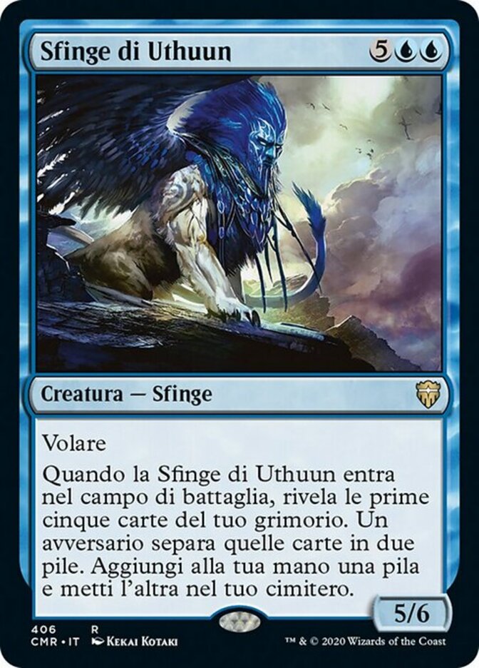 When Sphinx of Uthuun enters the battlefield, reveal the top five cards of your library. An opponent separates those cards into two piles. Put one pile into your hand and the other into your graveyard.