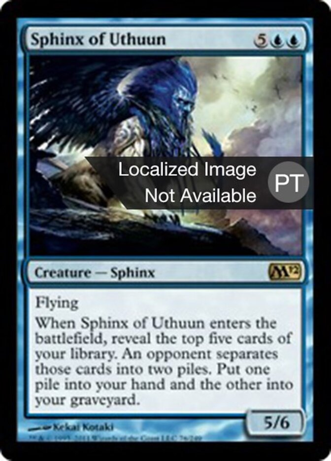 | Rules | Flying When Sphinx of Uthuun enters the battlefield, reveal the top five cards of your library. An opponent separates those cards into two piles. Put one pile into your hand and the other into your graveyard. |