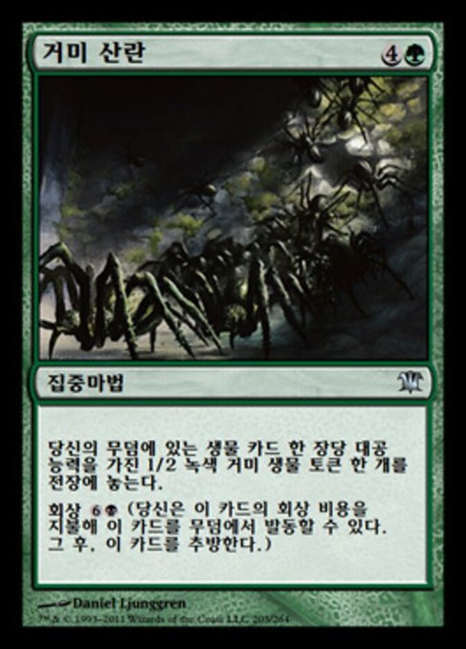 | Rules | Create a 1/2 green Spider creature token with reach for each creature card in your graveyard. Flashback (You may cast this card from your graveyard for its flashback cost. Then exile it.) |