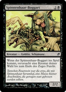 | Rules | When Spiderwig Boggart enters the battlefield, target creature gains fear until end of turn. (It can't be blocked except by artifact creatures and/or black creatures.) |