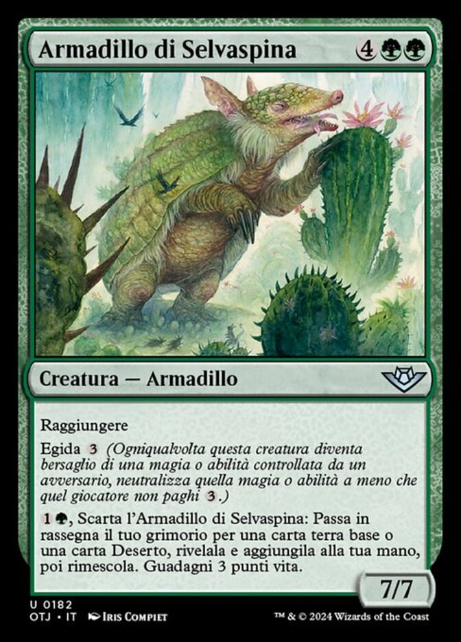 | Rules | Reach Ward (Whenever this creature becomes the target of a spell or ability an opponent controls, counter it unless that player pays .) , Discard Spinewoods Armadillo: Search your library for a basic land card or a Desert card, reveal it, put it into your hand, then shuffle. You gain 3 life. |