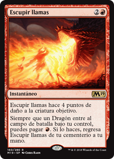 | Rules | Spit Flame deals 4 damage to target creature. Whenever a Dragon enters the battlefield under your control, you may pay . If you do, return Spit Flame from your graveyard to your hand. |