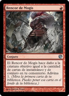 | Rules | Spite of Mogis deals damage to target creature equal to the number of instant and sorcery cards in your graveyard. Scry 1. (Look at the top card of your library. You may put that card on the bottom of your library.) |