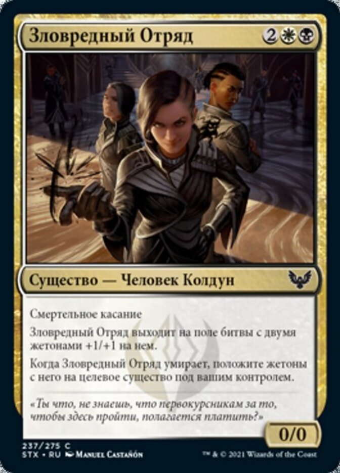 | Rules | Deathtouch Spiteful Squad enters the battlefield with two +1/+1 counters on it. When Spiteful Squad dies, put its counters on target creature you control. |