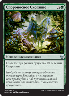| Rules | Create three 1/1 green Saproling creature tokens. |