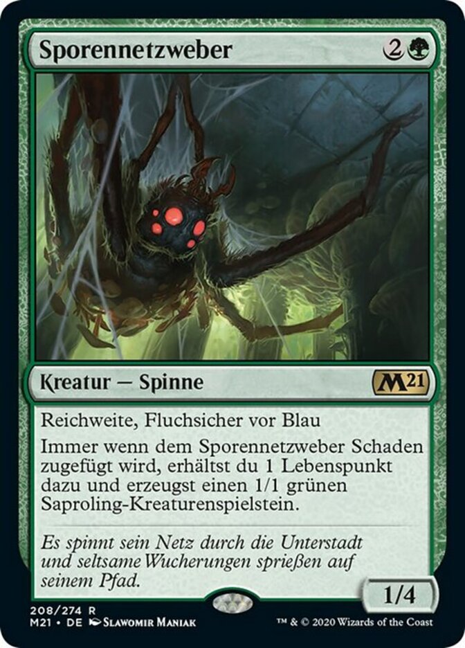 | Rules | Reach, hexproof from blue Whenever Sporeweb Weaver is dealt damage, you gain 1 life and create a 1/1 green Saproling creature token. |