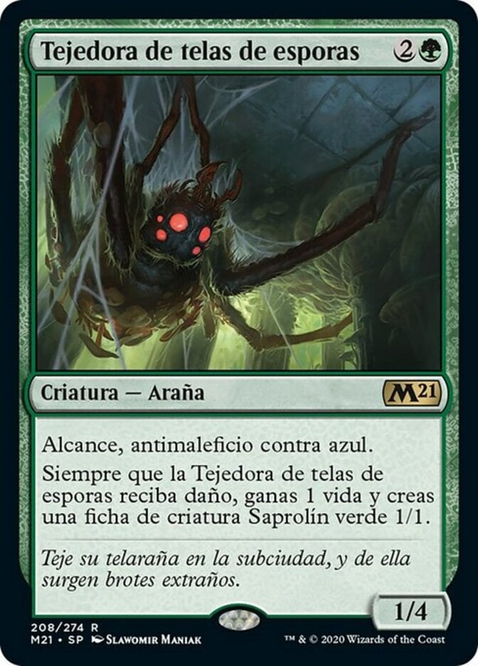 | Rules | Reach, hexproof from blue Whenever Sporeweb Weaver is dealt damage, you gain 1 life and create a 1/1 green Saproling creature token. |