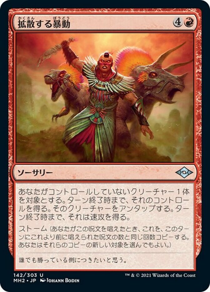 | Rules | Gain control of target creature you don't control until end of turn. Untap that creature. It gains haste until end of turn. Storm (When you cast this spell, copy it for each spell cast before it this turn. You may choose new targets for the copies.) |