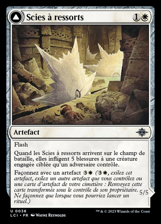 | Rules | Flash When Spring-Loaded Sawblades enters the battlefield, it deals 5 damage to target tapped creature an opponent controls. Craft with artifact (, Exile this artifact, Exile another artifact you control or an artifact card from your graveyard: Return this card transformed under its owner's control. Craft only as a sorcery.) // Tap two other untapped artifacts you control: Bladewheel Chariot becomes an artifact creature until end of turn. Crew 1 (Tap any number of creatures you control with total power 1 or more: This Vehicle becomes an artifact creature until end of turn.) |