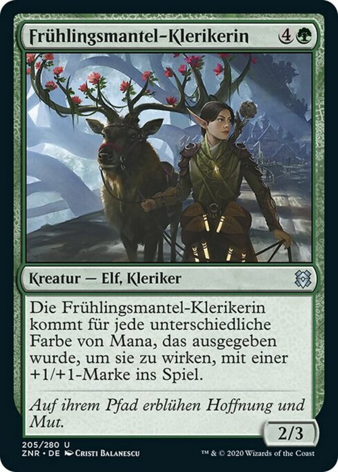 | Rules | Springmantle Cleric enters the battlefield with a +1/+1 counter on it for each color of mana spent to cast it. |