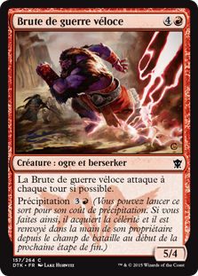 | Rules | Sprinting Warbrute attacks each combat if able. Dash (You may cast this spell for its dash cost. If you do, it gains haste, and it's returned from the battlefield to its owner's hand at the beginning of the next end step.) |