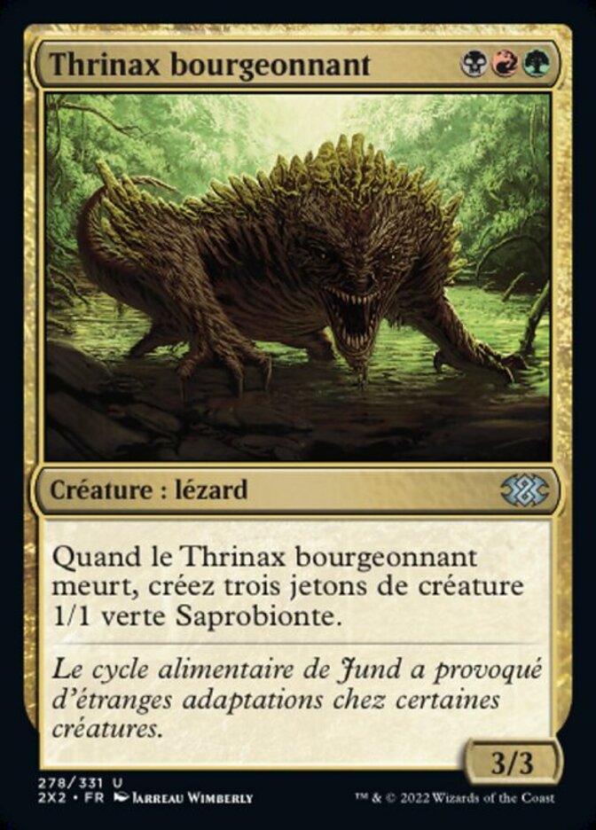 | Rules | When Sprouting Thrinax dies, create three 1/1 green Saproling creature tokens. |