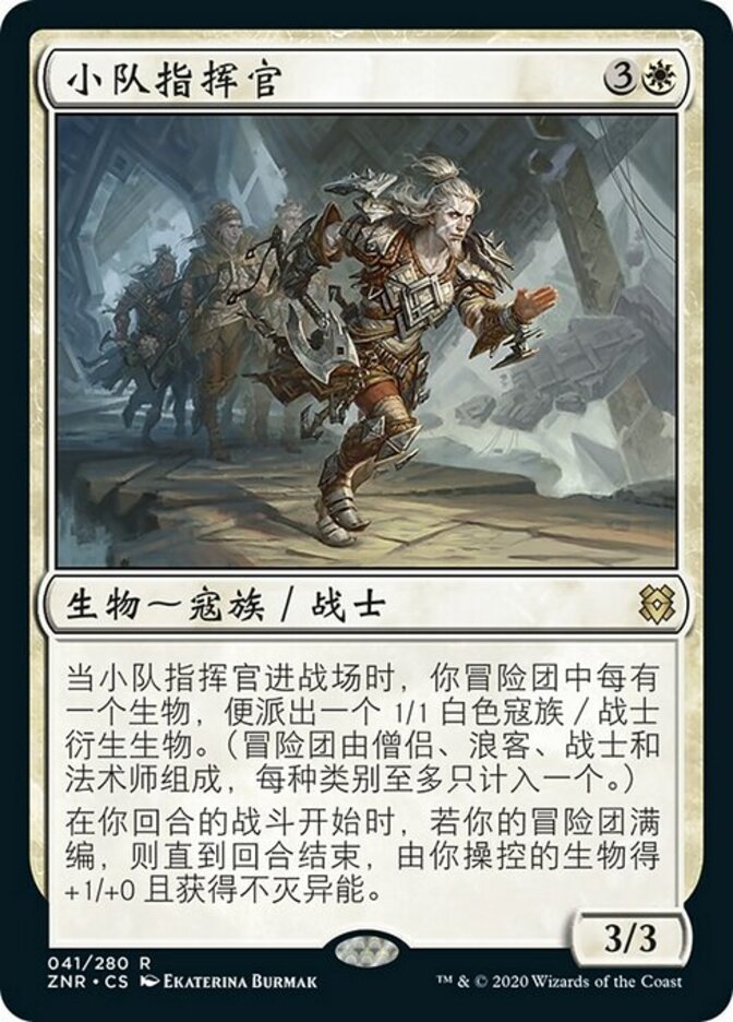 | Rules | When Squad Commander enters the battlefield, create a 1/1 white Kor Warrior creature token for each creature in your party. (Your party consists of up to one each of Cleric, Rogue, Warrior, and Wizard.) At the beginning of combat on your turn, if you have a full party, creatures you control get +1/+0 and gain indestructible until end of turn. |