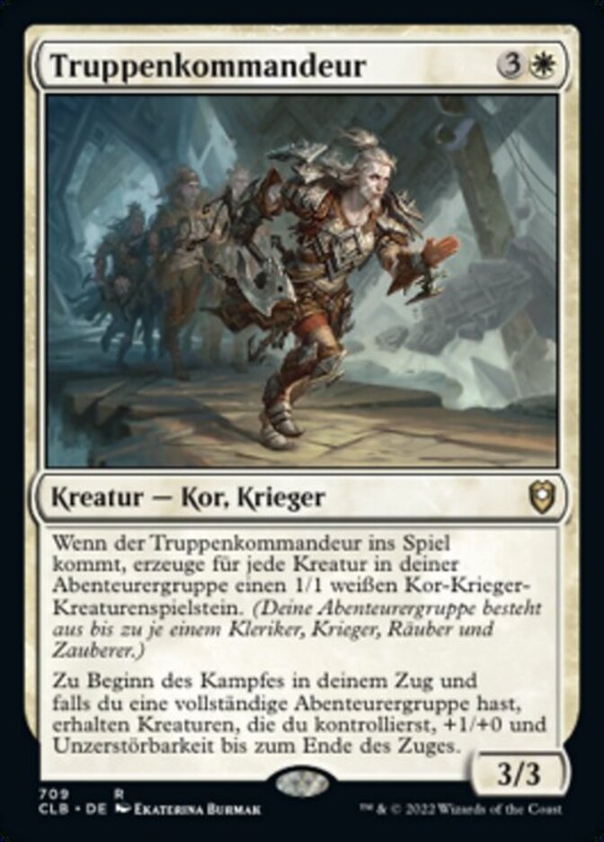 | Rules | When Squad Commander enters the battlefield, create a 1/1 white Kor Warrior creature token for each creature in your party. (Your party consists of up to one each of Cleric, Rogue, Warrior, and Wizard.) At the beginning of combat on your turn, if you have a full party, creatures you control get +1/+0 and gain indestructible until end of turn. |