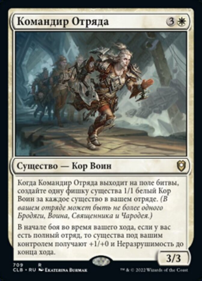 | Rules | When Squad Commander enters the battlefield, create a 1/1 white Kor Warrior creature token for each creature in your party. (Your party consists of up to one each of Cleric, Rogue, Warrior, and Wizard.) At the beginning of combat on your turn, if you have a full party, creatures you control get +1/+0 and gain indestructible until end of turn. |