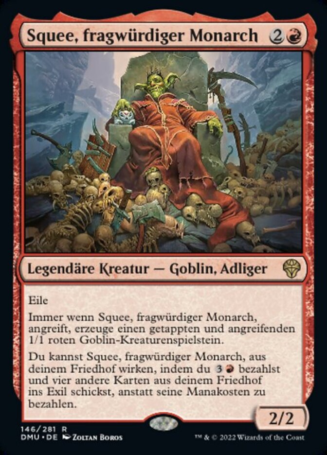 | Rules | Haste Whenever Squee, Dubious Monarch attacks, create a 1/1 red Goblin creature token that's tapped and attacking. You may cast Squee, Dubious Monarch from your graveyard by paying and exiling four other cards from your graveyard rather than paying its mana cost. |