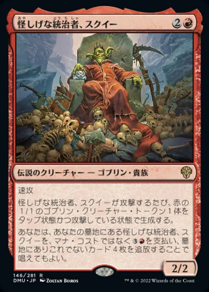 | Rules | Haste Whenever Squee, Dubious Monarch attacks, create a 1/1 red Goblin creature token that's tapped and attacking. You may cast Squee, Dubious Monarch from your graveyard by paying and exiling four other cards from your graveyard rather than paying its mana cost. |
