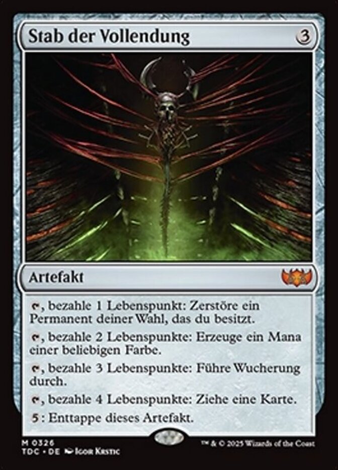 | Rules | , Pay 1 life: Destroy target permanent you own. , Pay 2 life: Add one mana of any color. , Pay 3 life: Proliferate. , Pay 4 life: Draw a card. : Untap Staff of Compleation. |