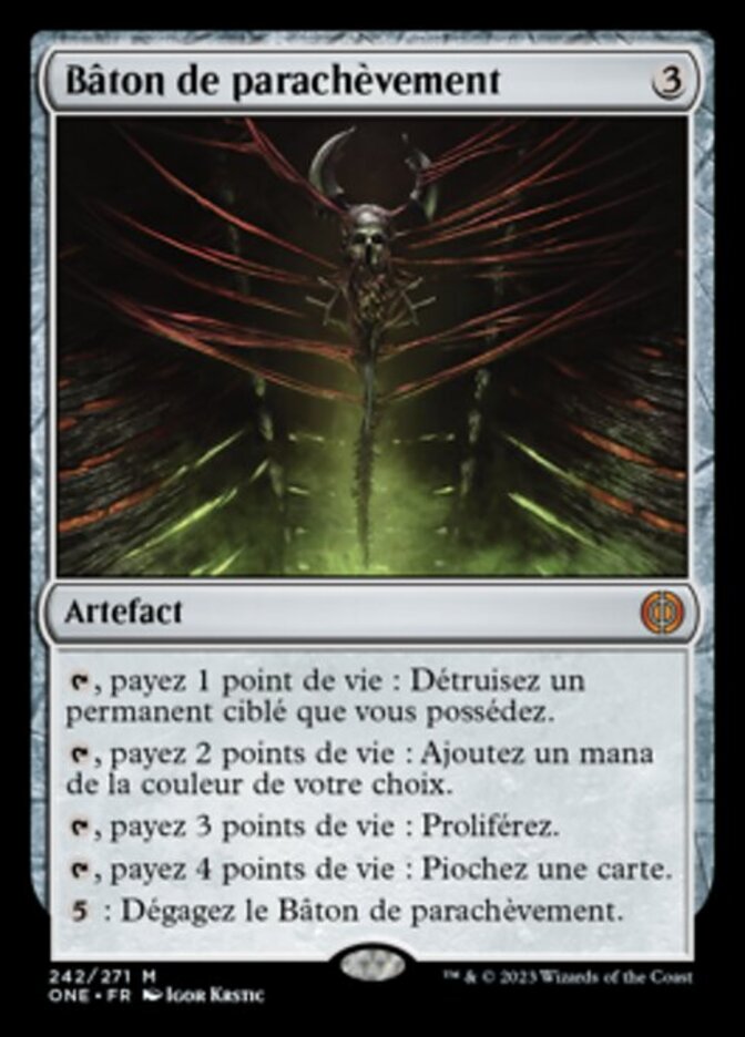 | Rules | , Pay 1 life: Destroy target permanent you own. , Pay 2 life: Add one mana of any color. , Pay 3 life: Proliferate. , Pay 4 life: Draw a card. : Untap Staff of Compleation. |