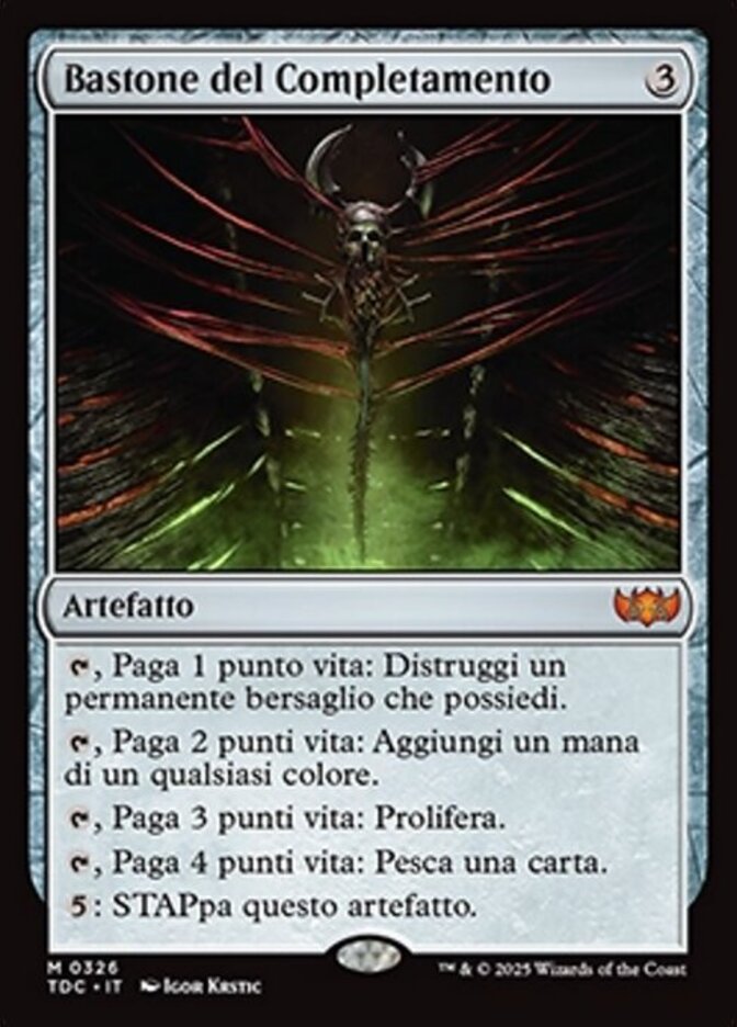| Rules | , Pay 1 life: Destroy target permanent you own. , Pay 2 life: Add one mana of any color. , Pay 3 life: Proliferate. , Pay 4 life: Draw a card. : Untap Staff of Compleation. |