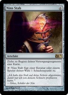 | Rules | At the beginning of your upkeep, draw a card. : Staff of Nin deals 1 damage to any target. |