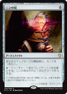| Rules | At the beginning of your upkeep, draw a card. : Staff of Nin deals 1 damage to any target. |