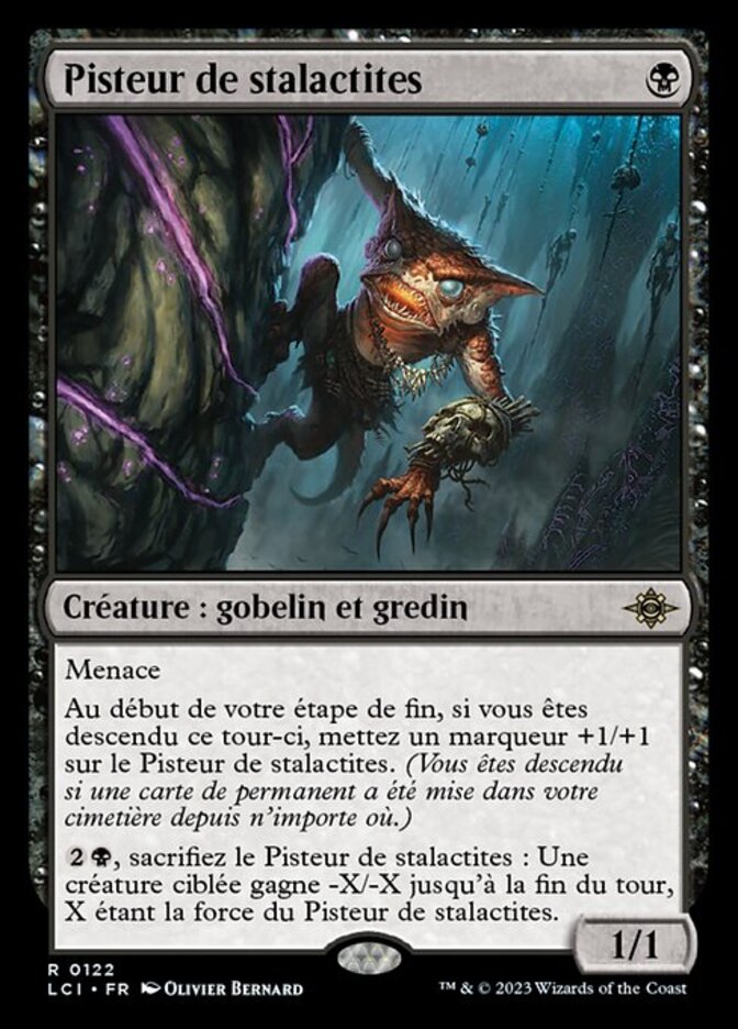 | Rules | Menace At the beginning of your end step, if you descended this turn, put a +1/+1 counter on Stalactite Stalker. , Sacrifice Stalactite Stalker: Target creature gets -X/-X until end of turn, where X is Stalactite Stalker's power. |